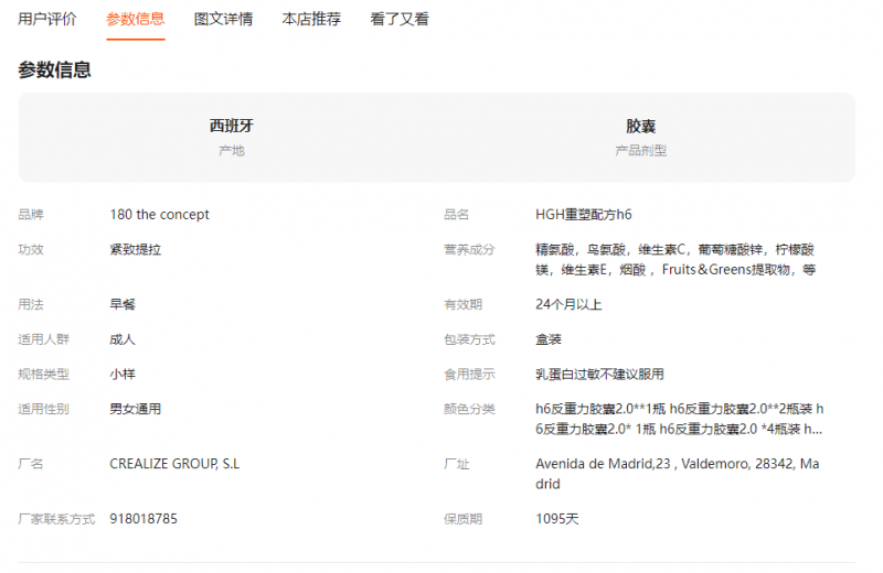 作为口服膳食补充剂,生产主体的资质合规是产品安全的基础。但记者通过西班牙企业注册信息平台查询发现,概念180标称的境外生产主体“CREALIZE GROUP SL”,其经营范围明确标注为“化妆品、卫生用品销售”,未包含任何食品或膳食补充剂相关类目,这意味着该主体根本不具备生产、销售口服产品的合法资质。