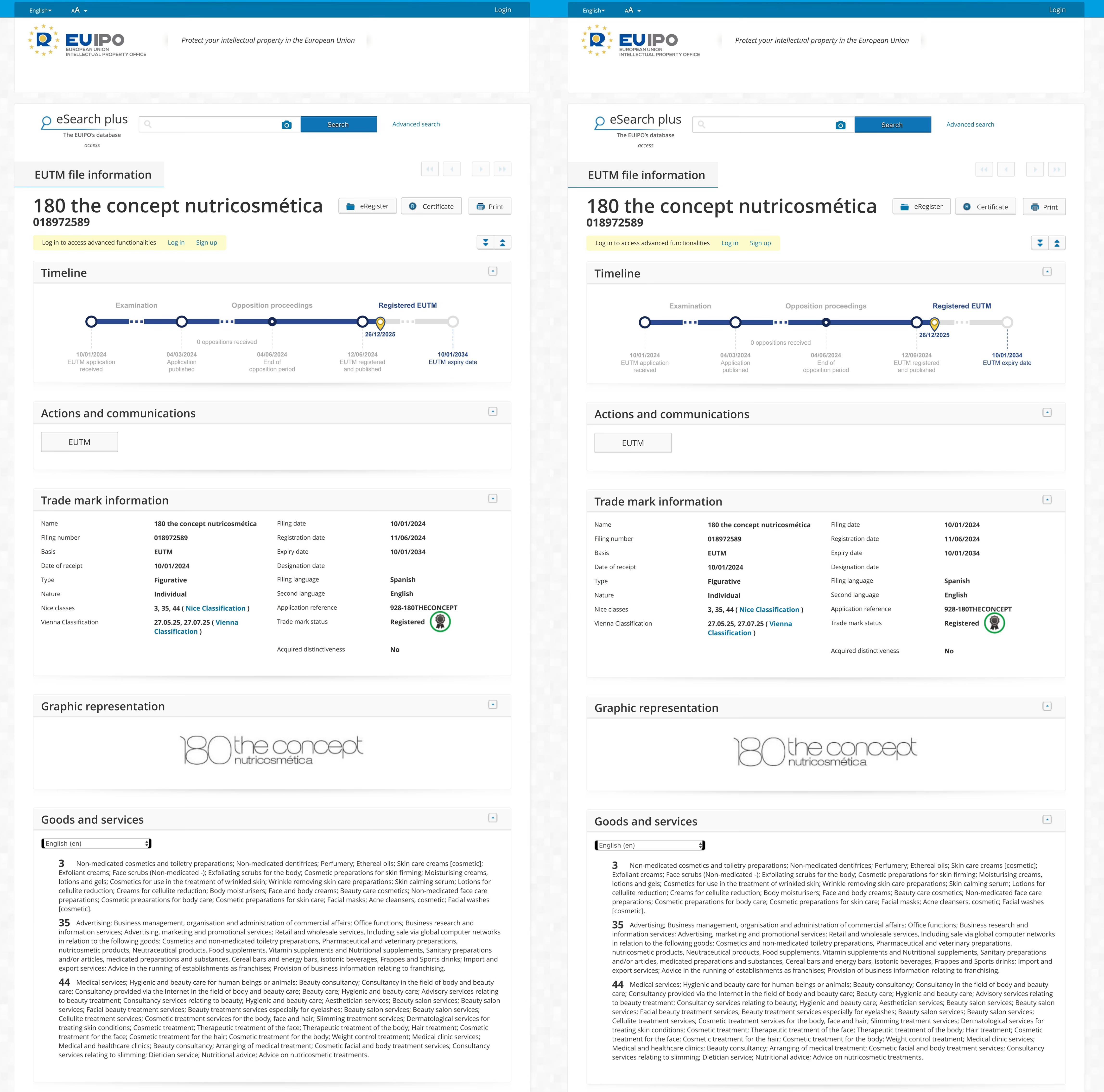 然而,记者在西班牙商标局(OEPM)及WIPO数据库的深度挖掘,戳破了这一叙事泡沫。市场上存在两个高度近似的商标主体:一个是“180 THE CONCEPT, BY GEMA CABAÑERO”(下称“180 GEMA”),另一个是“180 the concept nutricosmética”(即“概念180”)。